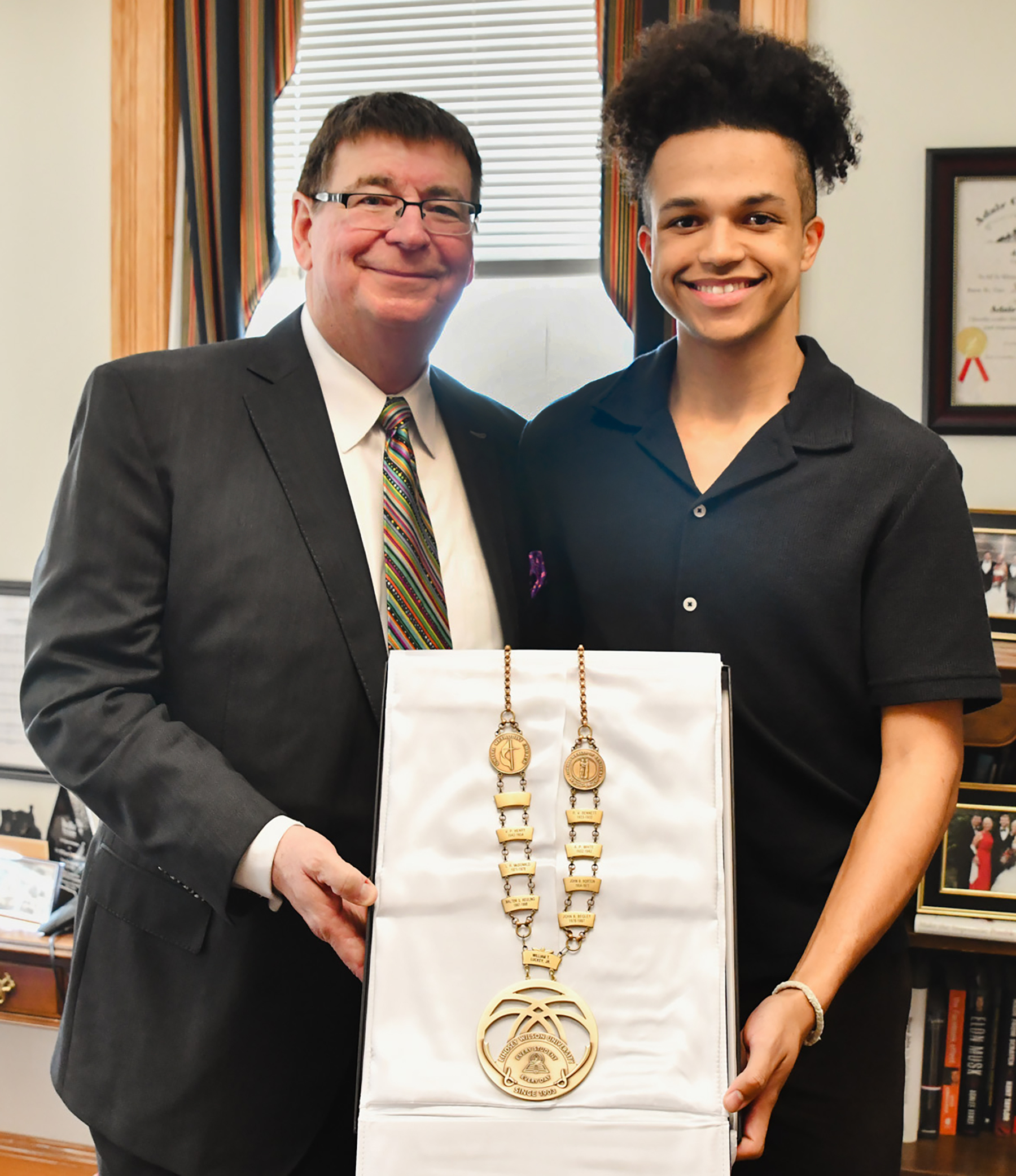 LWU President William T. Luckey Jr. will preside over the commencement ceremonies while wearing a new presidential medallion, which was designed by Lindsey Wilson student Tezon Mitchell '27 of Greensburg, Kentucky.