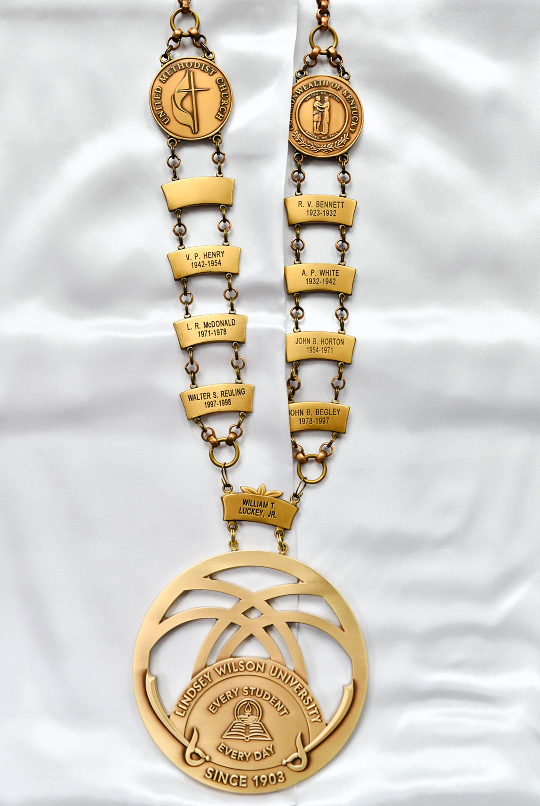 The new presidential medallion, which is made of brass, features "Lindsey Wilson University" below elements of the crown of the university's iconic John B. Begley Chapel. Below the school's name are the lamp of wisdom and book of knowledge taken from the university's new seal, which appear inside of the the words "every student, every day," a phrase that is the essence of the Lindsey Wilson mission.