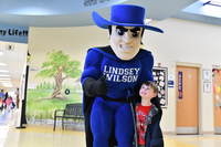 During Read Across Adair County, Lindsey Wilson students read children's stories to the schools' students while dressed as a character from the book; played activities based on the books; painted designs on children's faces; and organized games in the school's gymnasium. Lindsey Wilson mascot Blue Raider Bob patrolled halls and classrooms, and students and their family members also enjoyed free pizza and collected free children's books.