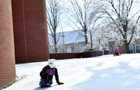 In addition to experiencing snow for the first time, some Lindsey Wilson students also experienced a school tradition for the first time -- sledding down the hill behind Keefe Hall, which runs behind the west goal of Walter S. Reuling Stadium. In the early fall, a water slide is held on the steep hill during Malvina Farkle Day, the university's annual day of service.